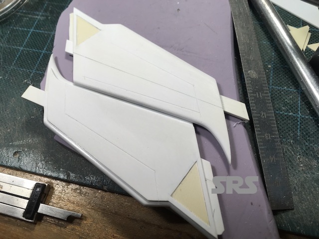 The top side of the pylons are made up of three pieces of styrene, one central piece to be the main support and connect to the strong back, then two on each side. They were then given their airfoil shape.