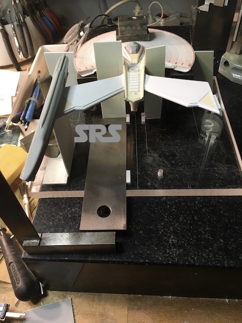 A nice square block, adding slots to locate the pylons, the stand and the neck that connects the saucer. I also added the recess for the deflector.